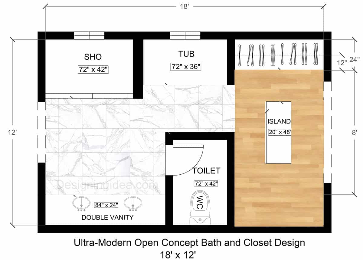Step across the continuous tile flooring and you transition to an 8-foot-wide walk-in closet with an island. The clothing storage is located on the upper side with double-rod hang at 12″ depth on top, and deeper 24″ wardrobe bank below for longer garments. Centered in the middle of the hardwood floored space is a slim 20″ × 48″ island, surrounded by a three-foot circulation path. Since there’s a lot of space left open, it is perfect for staging outfits, folding laundry or admiring your outfits in a full-height mirror.