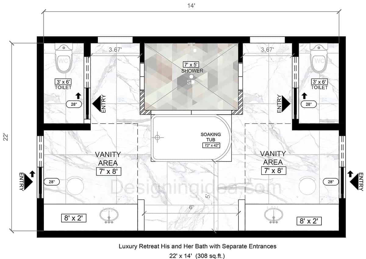 Floor Plan Details: This Jack and Jill style bathroom has two points of entry, one on the husband’s side, one on the wife’s that open into a 22-by-14-foot sanctuary. Each doorway deposits its owner directly into a private 7′ × 8′ vanity lounge area. Because the two grooming zones are mirror images, no one has to negotiate “your side / my side”, as they already exist.