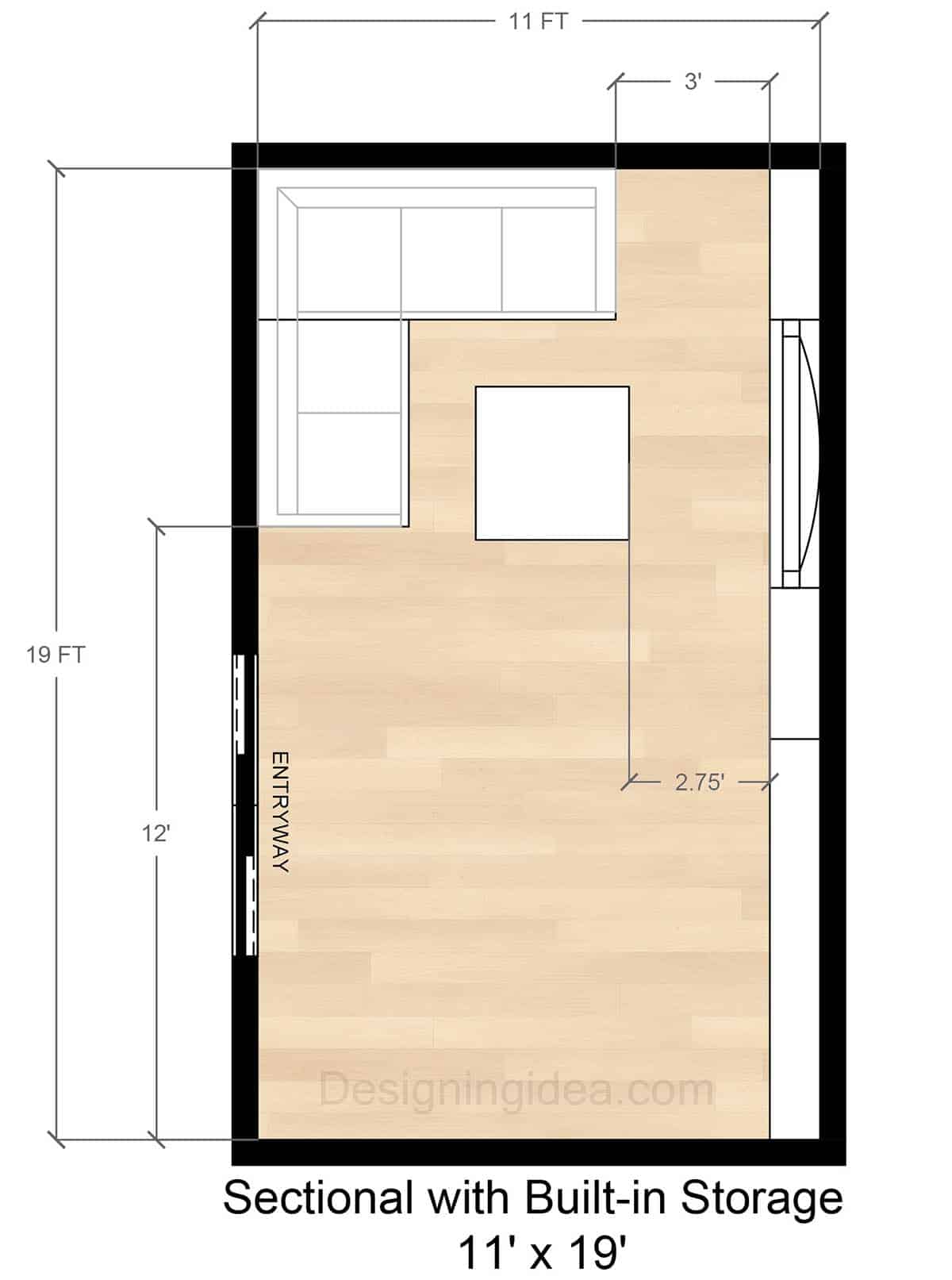 This layout works because it places a sectional and built-ins to consolidate seating and storage in one corner, which makes its 11′ wide space feel spacious and easy to move around in.